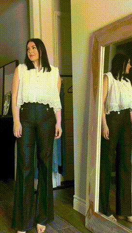 Β Our best-selling denim trousers, are refreshed with nautical details! This pair comes with a high rise and a full-length leg, plus patch pockets and our signature gold crest button details for added drama.Β
